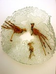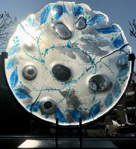 2015Glassculptuur / uniek schaaltje, {bevroren} water met bladeren en naar beneden gezakt en meegevoerde materialen.