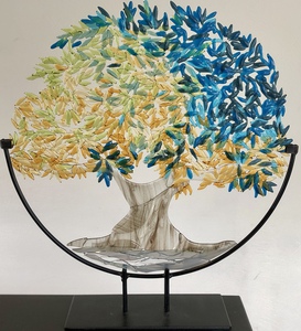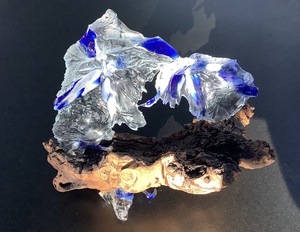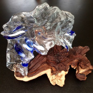 2016STROMING VAN WATER, IJS . VRIJSTAAND GLASOBJECT op HOUT. HET GLAS IS GEFUSED OP EEN ZELFGEMAAKTE EENMALIG TE GEBRUIKEN MAL.