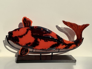 2010Gefushed en gebrandschilderd glas in de vorm van een vis, met watervogels, van messing. Wandobject. i.b.v. Fa. Bons en Evers Borne