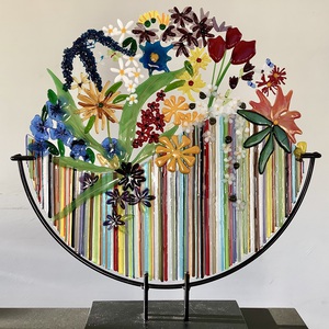 2011Schaal van gefushed glas, pate du verre, met gebrandschilderde bloemen die lijken te drijven op water.