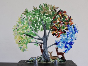 2023Opdracht: De kale boom op een rouwkaart met daaronder hertjes. De boom een 4 seizoenen bladerenkroon gegeven en het aantal hertjes teruggebracht naar 3. Staan voor dochter en haar twee broers