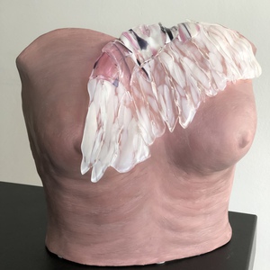 2021Moeder met de breekbare glazen vleugel van haar beschermengel op haar schouder en over haar hart.