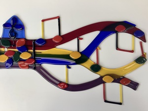 Notenbalk overgaand in golvend ritme met een muzieksleutel in het bovenraam van de grote kerkdeur. Muurobject